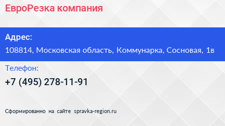 ЕвроРезка, компания по адресу 108814, Московская область, Коммунарка, Сосновая, 1в в дальнейшем Организация, размещена в следующих категориях: