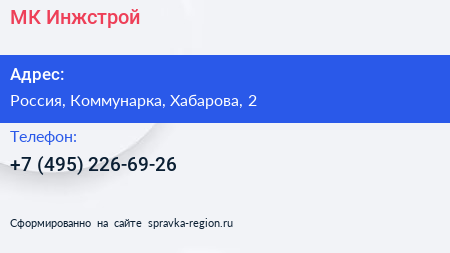 МК-Инжстрой по адресу Торгово-развлекательный комплекс "Новомосковский", 2, улица Хабарова, Филимонковский район, Московский, Москва, Центральный федеральный округ, 142784, Россия в дальнейшем Организация, размещена в следующих категориях: