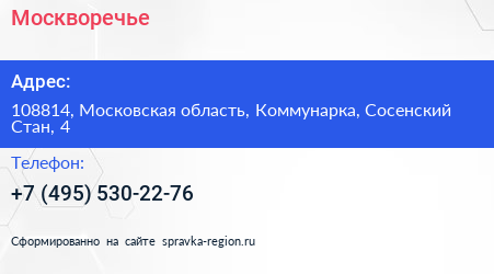 Москворечье по адресу 108814, Московская область, Коммунарка, Сосенский Стан, 4 в дальнейшем Организация, размещена в следующих категориях: