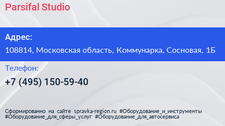 Parsifal Studio по адресу 108814, Московская область, Коммунарка, Сосновая, 1Б в дальнейшем Организация, размещена в следующих категориях: