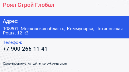 Роял Строй Глобал по адресу 108801, Московская область, Коммунарка, Потаповская Роща, 12 к3 в дальнейшем Организация, размещена в следующих категориях: