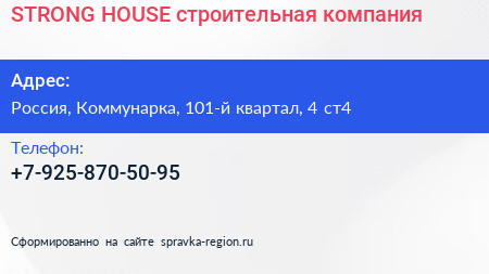 STRONG HOUSE, строительная компания по адресу Санаторий Главмосстроя "Валуево", Филимонковское шоссе, квартал № 101, Филимонковский район, Валуево, Ленинский городской округ, Москва, Центральный федеральный округ, 142780, Россия в дальнейшем Организация, размещена в следующих категориях: