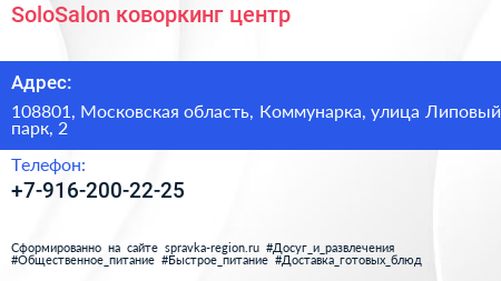 SoloSalon, коворкинг-центр по адресу 108801, Московская область, Коммунарка, улица Липовый парк, 2 в дальнейшем Организация, размещена в следующих категориях: