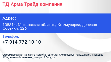 ТД Арма-Трейд, компания по адресу 108814, Московская область, Коммунарка, деревня Сосенки, 126 в дальнейшем Организация, размещена в следующих категориях: