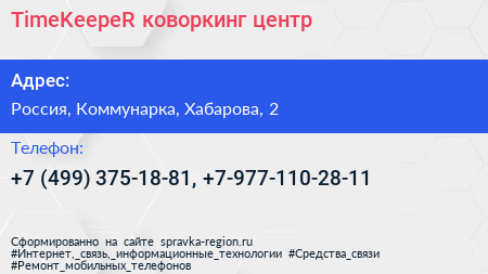 TimeKeepeR, коворкинг-центр по адресу Торгово-развлекательный комплекс "Новомосковский", 2, улица Хабарова, Филимонковский район, Московский, Москва, Центральный федеральный округ, 142784, Россия в дальнейшем Организация, размещена в следующих категориях: