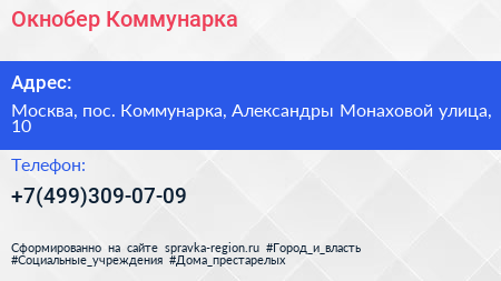 Окнобер Коммунарка по адресу Москва, пос. Коммунарка, Александры Монаховой улица, 10 в дальнейшем Организация, размещена в следующих категориях: