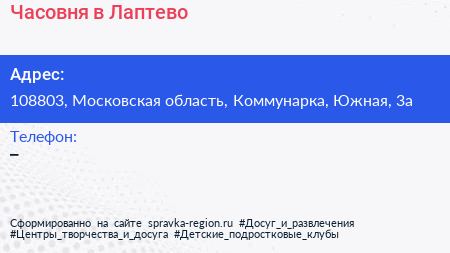 Часовня в Лаптево по адресу 108803, Московская область, Коммунарка, Южная, 3а в дальнейшем Организация, размещена в следующих категориях: