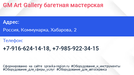 GM Art Gallery, багетная мастерская по адресу Торгово-развлекательный комплекс "Новомосковский", 2, улица Хабарова, Филимонковский район, Московский, Москва, Центральный федеральный округ, 142784, Россия в дальнейшем Организация, размещена в следующих категориях: