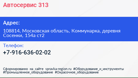 Автосервис 313 по адресу 108814, Московская область, Коммунарка, деревня Сосенки, 154а ст2 в дальнейшем Организация, размещена в следующих категориях: