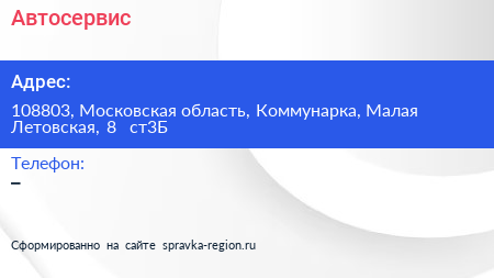 Автосервис по адресу 108803, Московская область, Коммунарка, Малая Летовская, 8 ст3Б в дальнейшем Организация, размещена в следующих категориях: