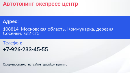 Автотонинг, экспресс-центр по адресу 108814, Московская область, Коммунарка, деревня Сосенки, вл2 ст5 в дальнейшем Организация, размещена в следующих категориях: