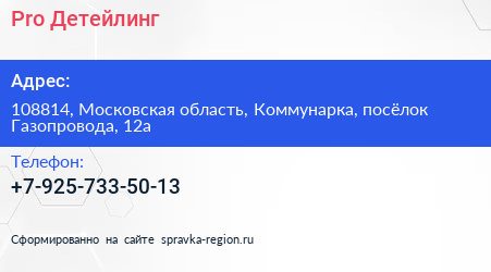Pro-Детейлинг по адресу 108814, Московская область, Коммунарка, посёлок Газопровода, 12а в дальнейшем Организация, размещена в следующих категориях: