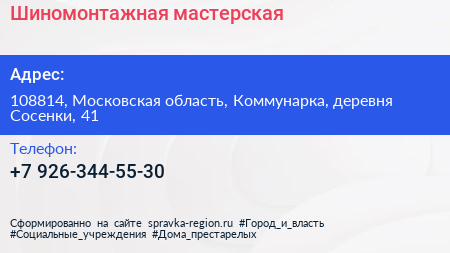 Шиномонтажная мастерская по адресу 108814, Московская область, Коммунарка, деревня Сосенки, 41 в дальнейшем Организация, размещена в следующих категориях: