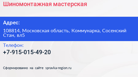 Шиномонтажная мастерская по адресу 108814, Московская область, Коммунарка, Сосенский Стан, вл5 в дальнейшем Организация, размещена в следующих категориях: