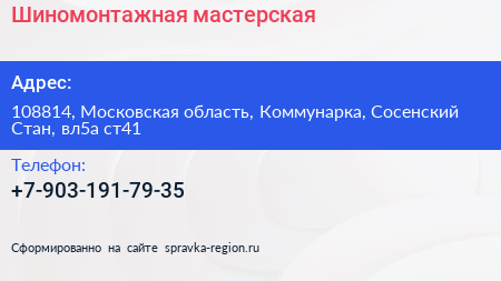 Шиномонтажная мастерская по адресу 108814, Московская область, Коммунарка, Сосенский Стан, вл5а ст41 в дальнейшем Организация, размещена в следующих категориях: