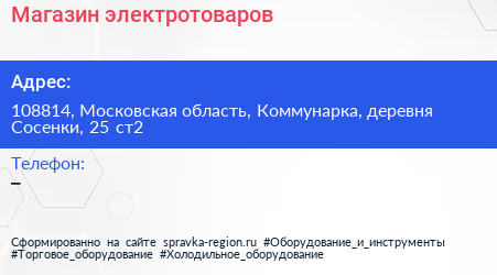 Магазин электротоваров по адресу 108814, Московская область, Коммунарка, деревня Сосенки, 25 ст2 в дальнейшем Организация, размещена в следующих категориях: