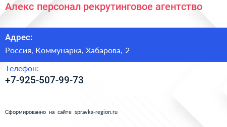 Алекс персонал, рекрутинговое агентство по адресу Торгово-развлекательный комплекс "Новомосковский", 2, улица Хабарова, Филимонковский район, Московский, Москва, Центральный федеральный округ, 142784, Россия в дальнейшем Организация, размещена в следующих категориях: