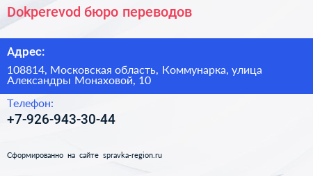 Dokperevod, бюро переводов по адресу 108814, Московская область, Коммунарка, улица Александры Монаховой, 10 в дальнейшем Организация, размещена в следующих категориях: