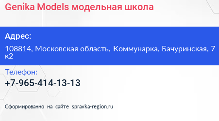 Genika Models, модельная школа по адресу 108814, Московская область, Коммунарка, Бачуринская, 7 к2 в дальнейшем Организация, размещена в следующих категориях: