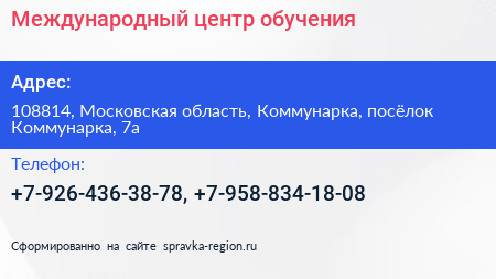 Международный центр обучения по адресу 108814, Московская область, Коммунарка, посёлок Коммунарка, 7а в дальнейшем Организация, размещена в следующих категориях: