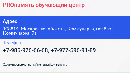 PROпамять, обучающий центр по адресу 108814, Московская область, Коммунарка, посёлок Коммунарка, 7а в дальнейшем Организация, размещена в следующих категориях: