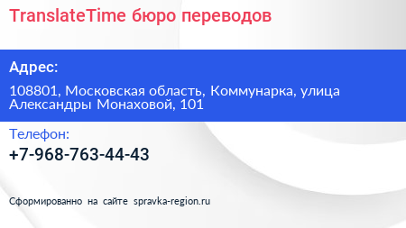 TranslateTime, бюро переводов по адресу 108801, Московская область, Коммунарка, улица Александры Монаховой, 101 в дальнейшем Организация, размещена в следующих категориях: