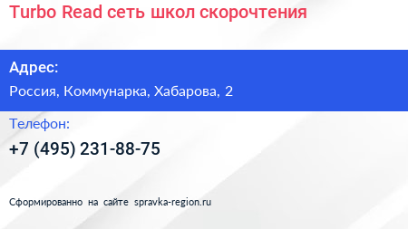 Turbo Read, сеть школ скорочтения по адресу Торгово-развлекательный комплекс "Новомосковский", 2, улица Хабарова, Филимонковский район, Московский, Москва, Центральный федеральный округ, 142784, Россия в дальнейшем Организация, размещена в следующих категориях:
