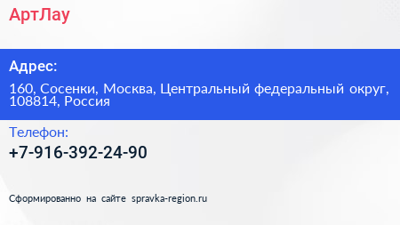 АртЛау по адресу 160, Сосенки, Москва, Центральный федеральный округ, 108814, Россия в дальнейшем Организация, размещена в следующих категориях: