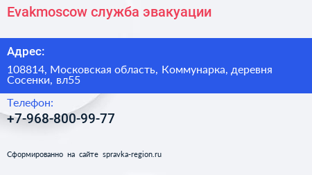 Evakmoscow, служба эвакуации по адресу 108814, Московская область, Коммунарка, деревня Сосенки, вл55 в дальнейшем Организация, размещена в следующих категориях: