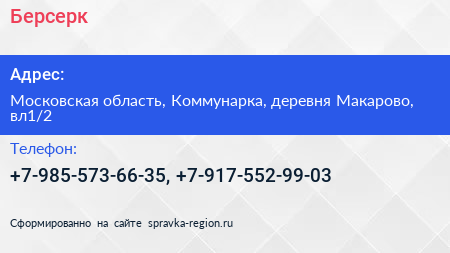 Берсерк по адресу Московская область, Коммунарка, деревня Макарово, вл1/2 в дальнейшем Организация, размещена в следующих категориях: