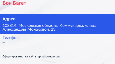 Бон Багет по адресу 108814, Московская область, Коммунарка, улица Александры Монаховой, 23 в дальнейшем Организация, размещена в следующих категориях: