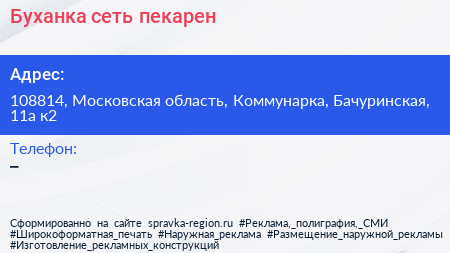 Буханка, сеть пекарен по адресу 108814, Московская область, Коммунарка, Бачуринская, 11а к2 в дальнейшем Организация, размещена в следующих категориях: