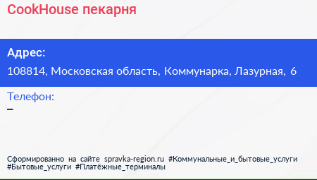 CookHouse, пекарня по адресу 108814, Московская область, Коммунарка, Лазурная, 6 в дальнейшем Организация, размещена в следующих категориях: