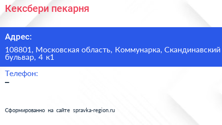 Кексбери, пекарня по адресу 108801, Московская область, Коммунарка, Скандинавский бульвар, 4 к1 в дальнейшем Организация, размещена в следующих категориях:
