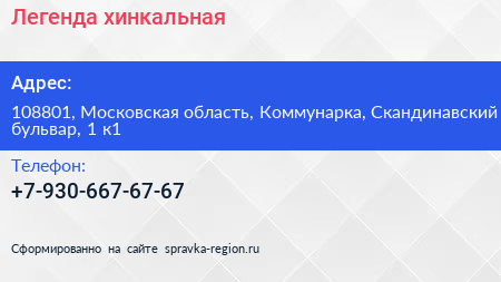 Легенда, хинкальная по адресу 108801, Московская область, Коммунарка, Скандинавский бульвар, 1 к1 в дальнейшем Организация, размещена в следующих категориях:
