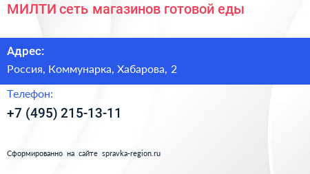МИЛТИ, сеть магазинов готовой еды по адресу Торгово-развлекательный комплекс "Новомосковский", 2, улица Хабарова, Филимонковский район, Московский, Москва, Центральный федеральный округ, 142784, Россия в дальнейшем Организация, размещена в следующих категориях:
