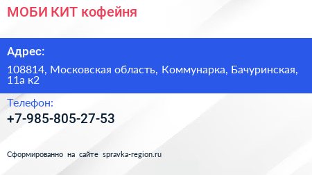 МОБИ КИТ, кофейня по адресу 108814, Московская область, Коммунарка, Бачуринская, 11а к2 в дальнейшем Организация, размещена в следующих категориях: