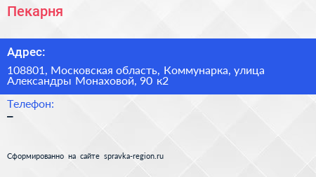 Пекарня по адресу 108801, Московская область, Коммунарка, улица Александры Монаховой, 90 к2 в дальнейшем Организация, размещена в следующих категориях: