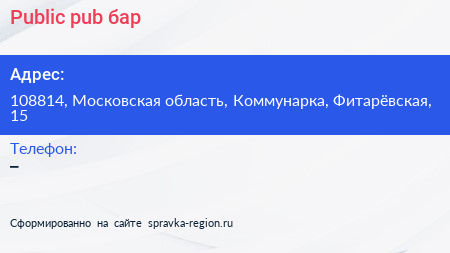 Public pub, бар по адресу 108814, Московская область, Коммунарка, Фитарёвская, 15 в дальнейшем Организация, размещена в следующих категориях: