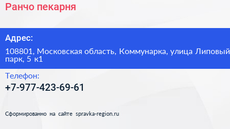 Ранчо, пекарня по адресу 108801, Московская область, Коммунарка, улица Липовый парк, 5 к1 в дальнейшем Организация, размещена в следующих категориях: