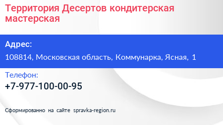 Территория Десертов, кондитерская мастерская по адресу 108814, Московская область, Коммунарка, Ясная, 1 в дальнейшем Организация, размещена в следующих категориях: