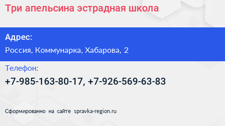 Три апельсина, эстрадная школа по адресу Торгово-развлекательный комплекс "Новомосковский", 2, улица Хабарова, Филимонковский район, Московский, Москва, Центральный федеральный округ, 142784, Россия в дальнейшем Организация, размещена в следующих категориях: