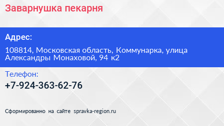 Заварнушка, пекарня по адресу 108814, Московская область, Коммунарка, улица Александры Монаховой, 94 к2 в дальнейшем Организация, размещена в следующих категориях:
