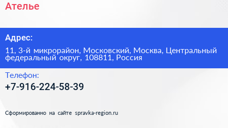 Ателье по адресу 11, 3-й микрорайон, Московский, Москва, Центральный федеральный округ, 108811, Россия в дальнейшем Организация, размещена в следующих категориях: