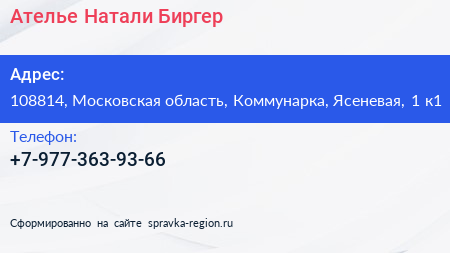 Ателье Натали Биргер по адресу 108814, Московская область, Коммунарка, Ясеневая, 1 к1 в дальнейшем Организация, размещена в следующих категориях: