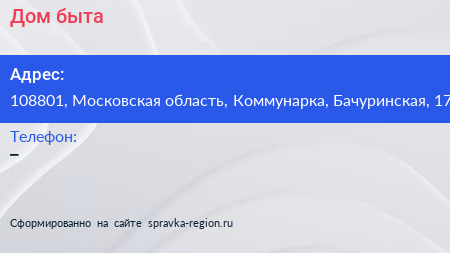 Дом быта по адресу 108801, Московская область, Коммунарка, Бачуринская, 17 в дальнейшем Организация, размещена в следующих категориях: