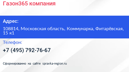 Газон365, компания по адресу 108814, Московская область, Коммунарка, Фитарёвская, 15 к1 в дальнейшем Организация, размещена в следующих категориях: