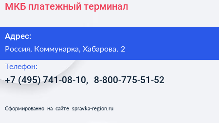 МКБ, платежный терминал по адресу Торгово-развлекательный комплекс "Новомосковский", 2, улица Хабарова, Филимонковский район, Московский, Москва, Центральный федеральный округ, 142784, Россия в дальнейшем Организация, размещена в следующих категориях: