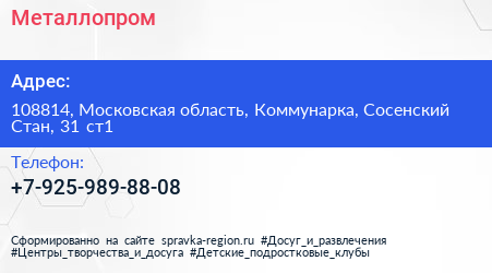 Металлопром по адресу 108814, Московская область, Коммунарка, Сосенский Стан, 31 ст1 в дальнейшем Организация, размещена в следующих категориях: