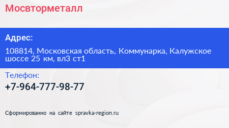 Мосвторметалл по адресу 108814, Московская область, Коммунарка, Калужское шоссе 25 км, вл3 ст1 в дальнейшем Организация, размещена в следующих категориях: